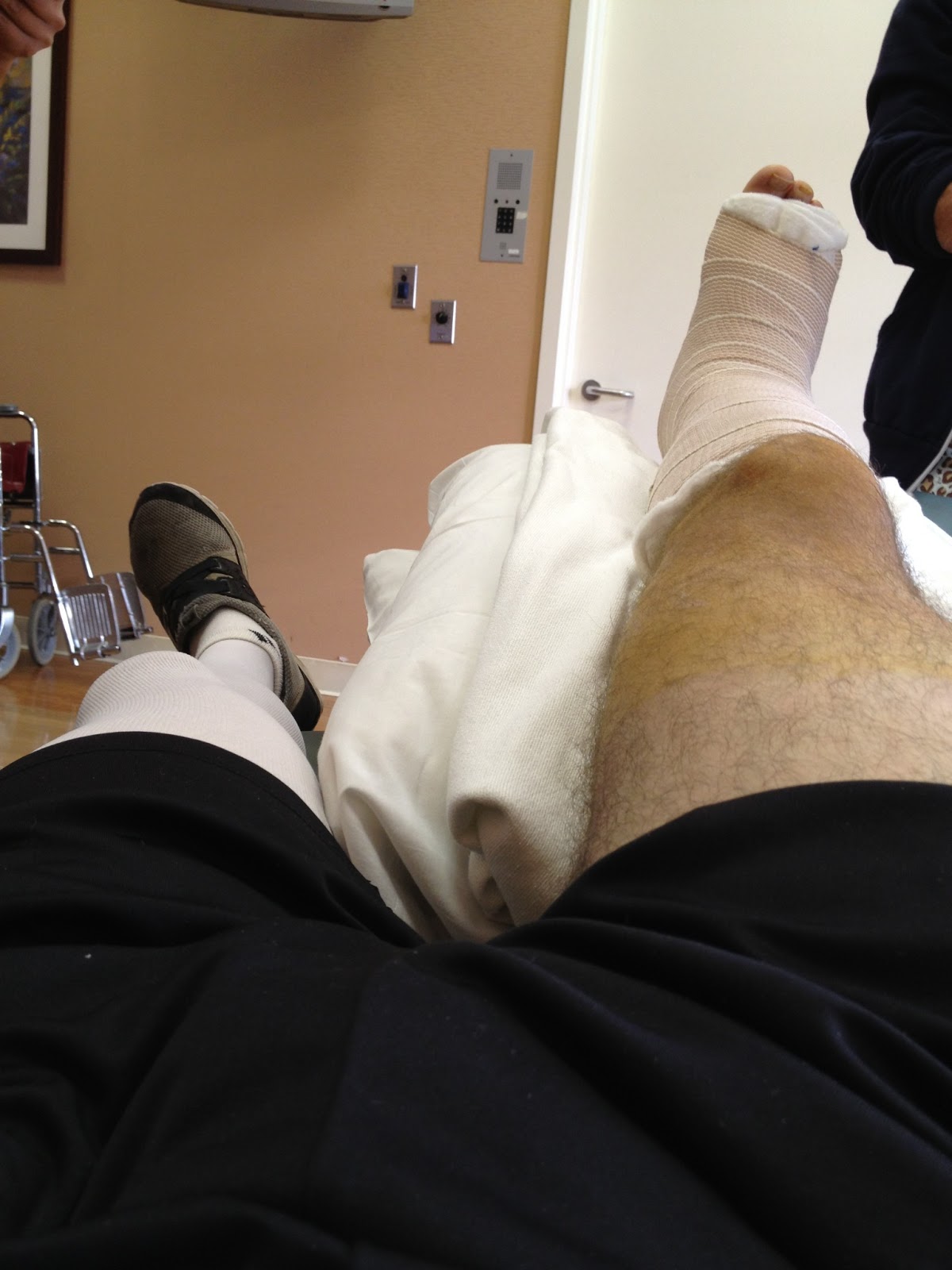 I iced and elevated the leg on the side lines and then got back on the team bus for the return trip home. I was in some amount of pain, so I medicated with tylenol and beer. I still didn't know it was broken, so I walked favoring the healthy foot but without avoiding the broken one.